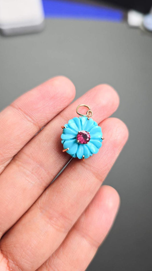 14k Solid gold Carved Turquoise flower with Tourmaline