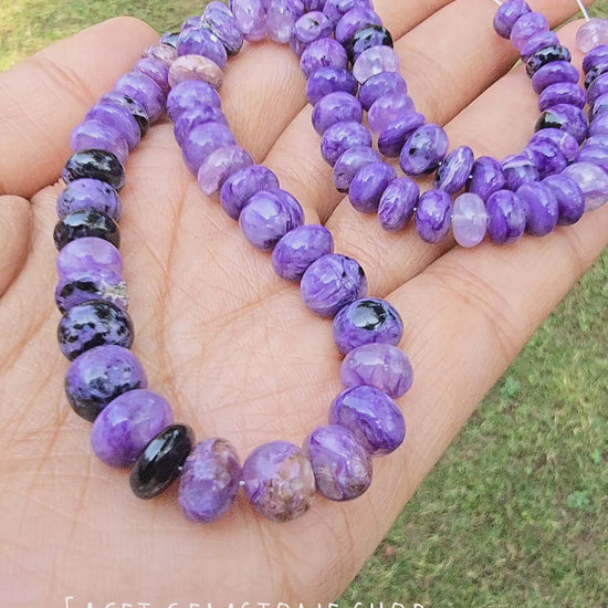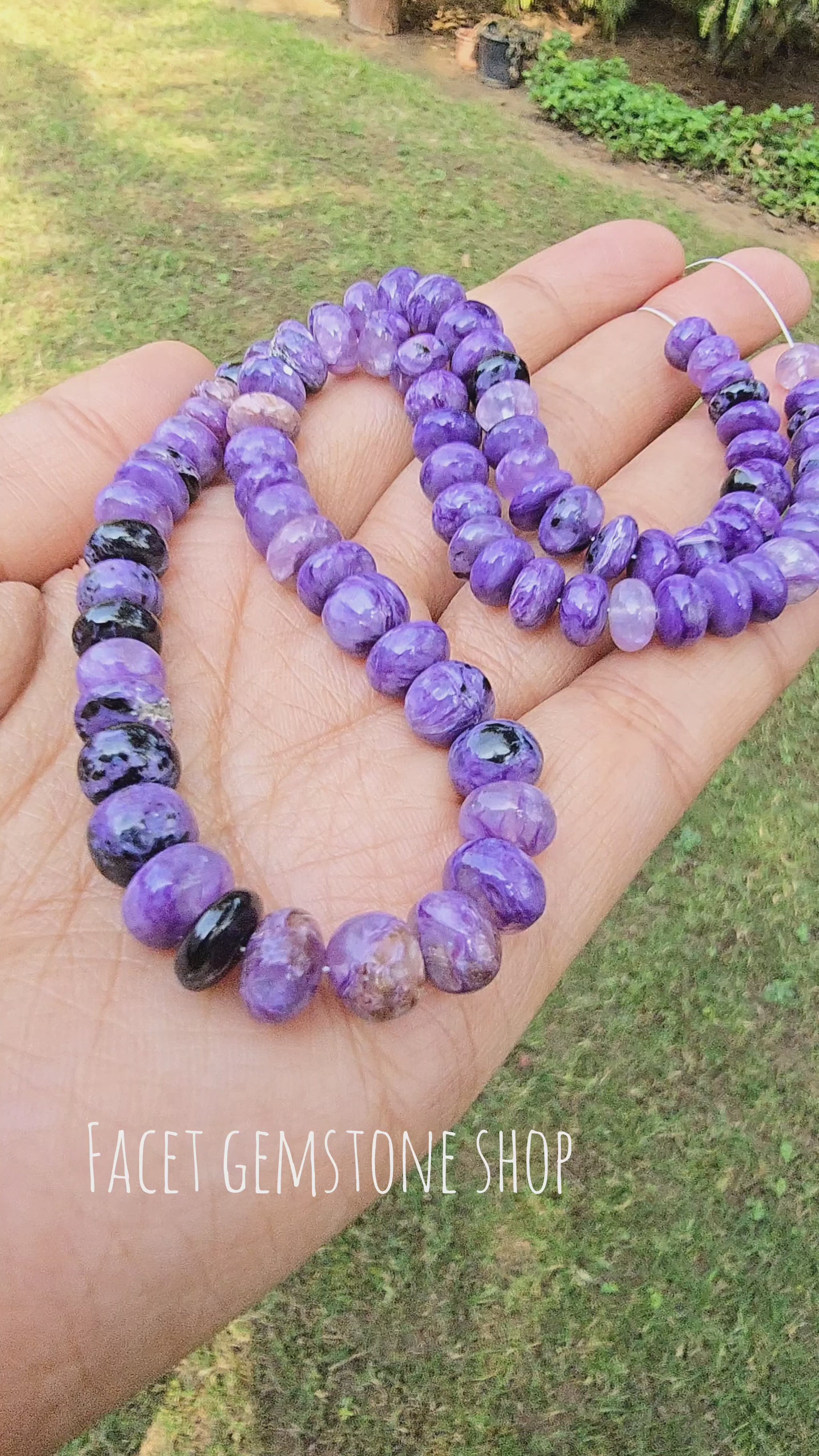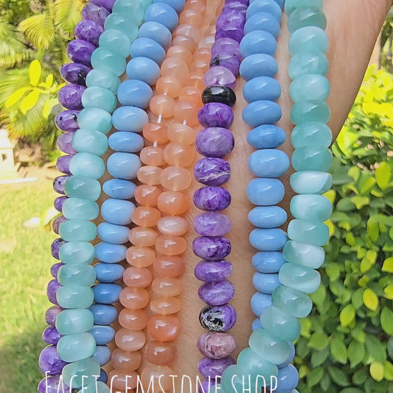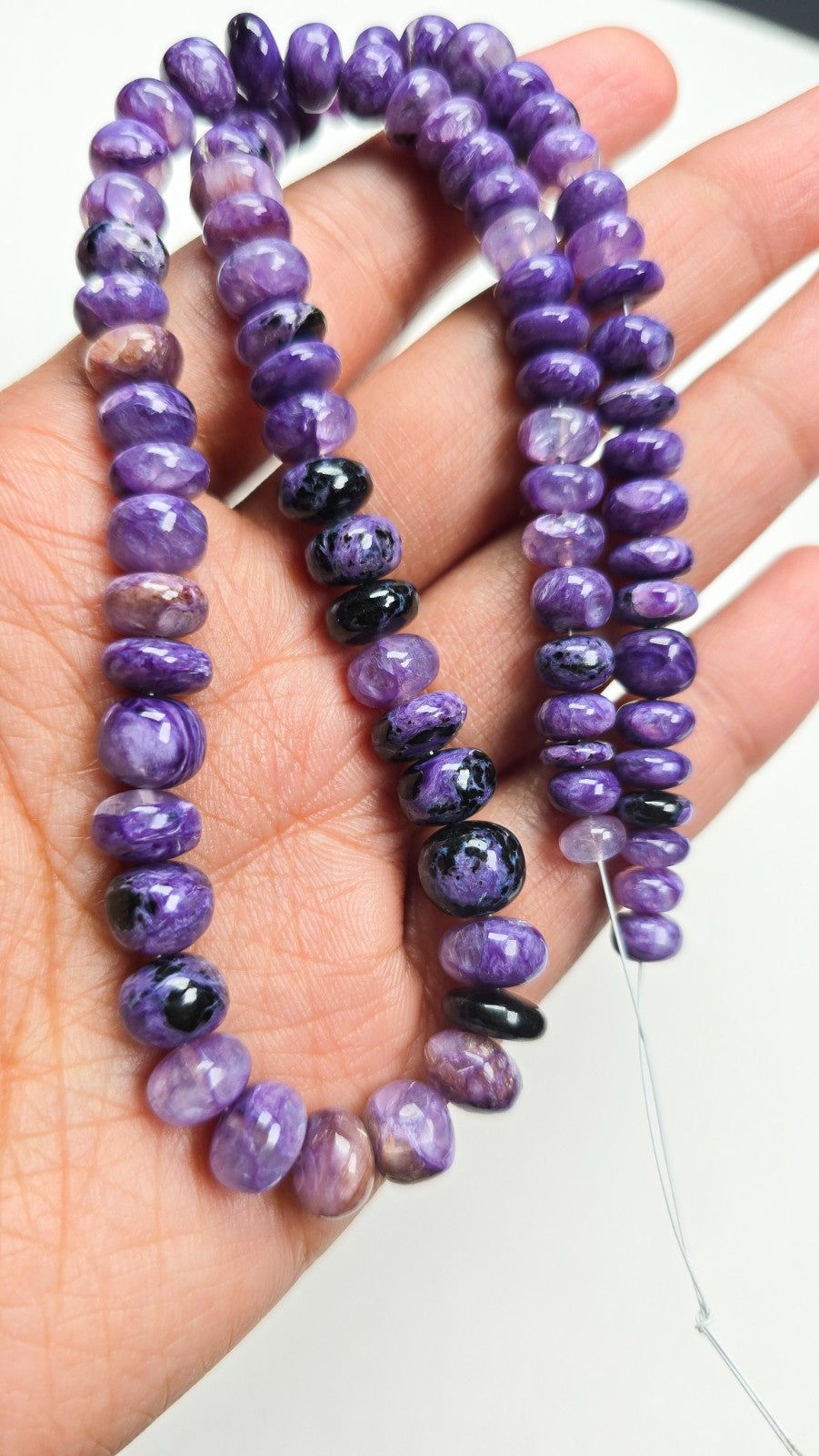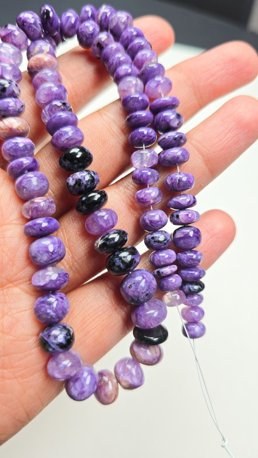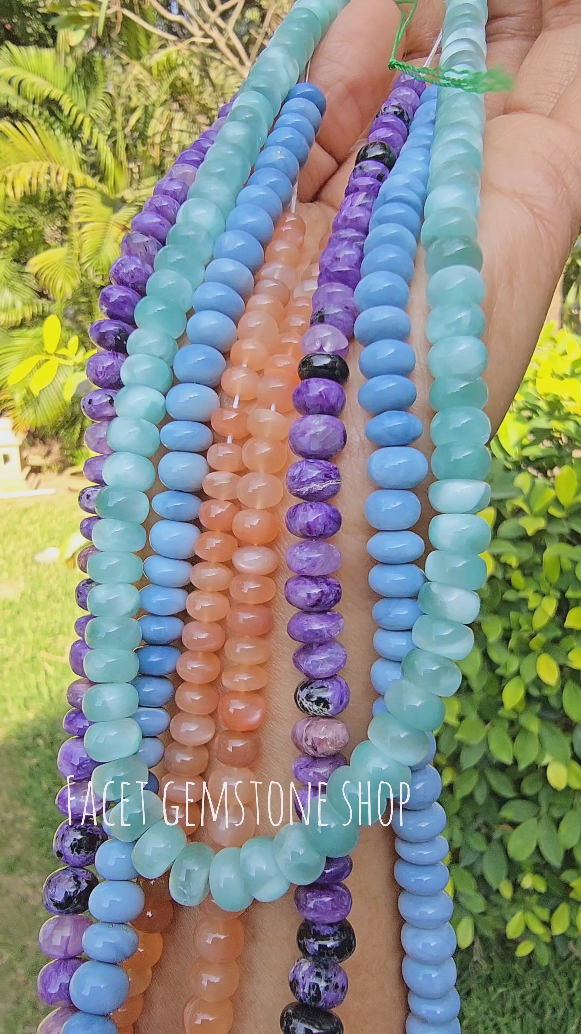Chariote in smooth rondelles. Each strand is unique with unique patterns on each bead making them very special.